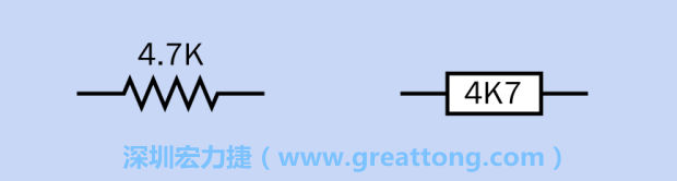 如果電阻值印在電路圖上,復(fù)印品質(zhì)不好可能會造成小數(shù)點遺失、或者產(chǎn)生讓人誤解成小數(shù)點的污漬。歐洲系統(tǒng)為了解決這個問題,就使用字母來代替小數(shù)點,所以,5.6k電阻就印成5k6電阻,3.3M電阻則印為3M3,但是,這種標示用法在美國并不多見。