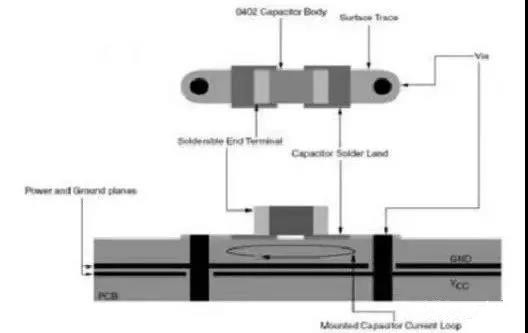 在安裝電容時,要從焊盤拉出一小段引出線,然后通過過孔和電源平面連接,接地端也是同樣。這樣流經(jīng)電容的電流回路為:電源平面-》過孔-》引出線-》焊盤-》電容-》焊盤-》引出線-》過孔-》地平面。